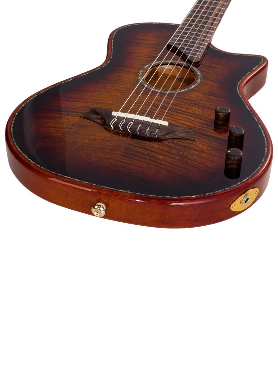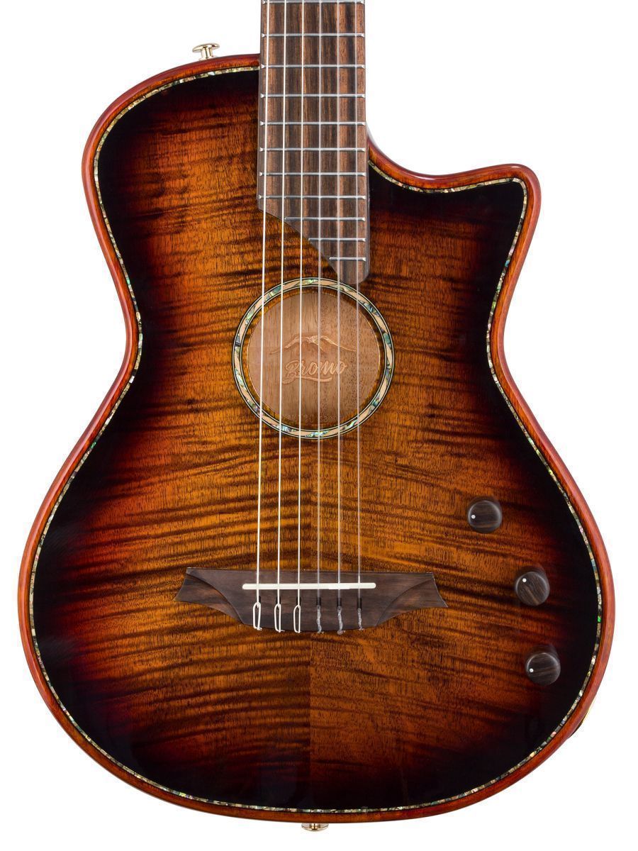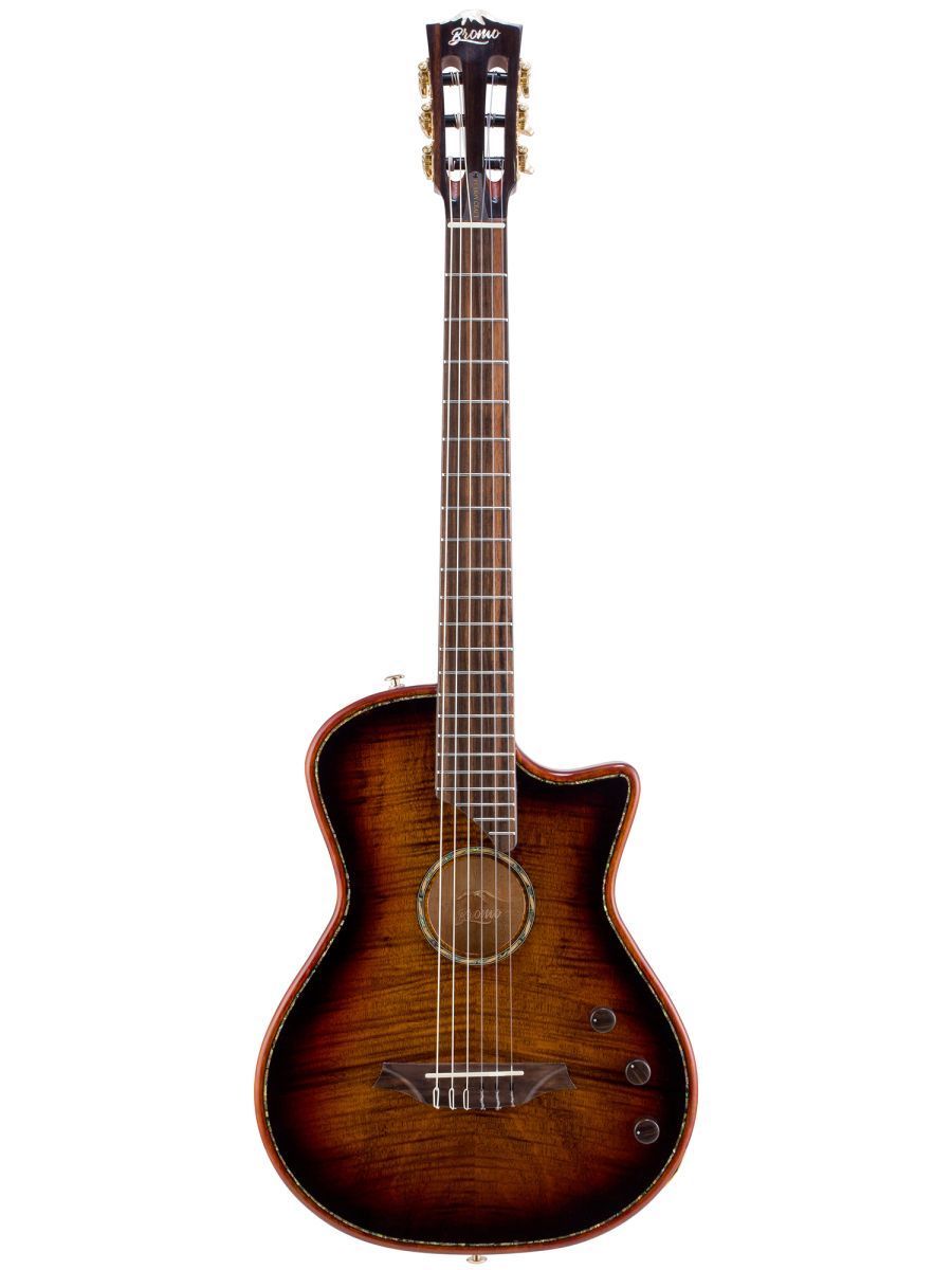 Bromo BEN2C3TS Гитара полуакустическая с нейлоновыми струнами, корпус: махагони, верхняя дека: ель с шпоном из огненного окуме класса 5A, гриф: махагони, накладка грифа: макассарский эбен, двухсторонний анкер, колки: винтажные, «Mt. Bromo» позолоченные, электроника: пьезодатчик + 3-позиционный звукосниматель под струнодержателем, глянцевый лак, цвет: 3 Tone Sunburst, в утепленном жестком кейсе