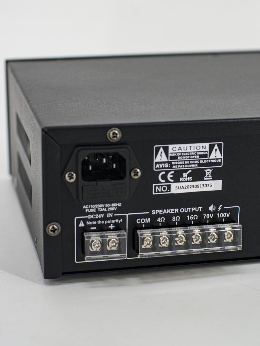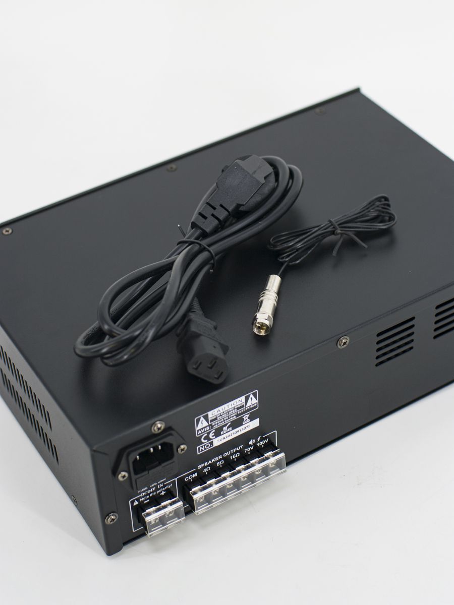 Мощность: 30Вт Разъемы: 2 Mic, 1 Aux Линейный выход: 70В/100В/4-16Ом Частотный диапазон: 60-15000Гц Источник питания: 230В AC и 24В DC; 50-60Гц Размеры: 320×210×90 мм Вес: 3,5 кг