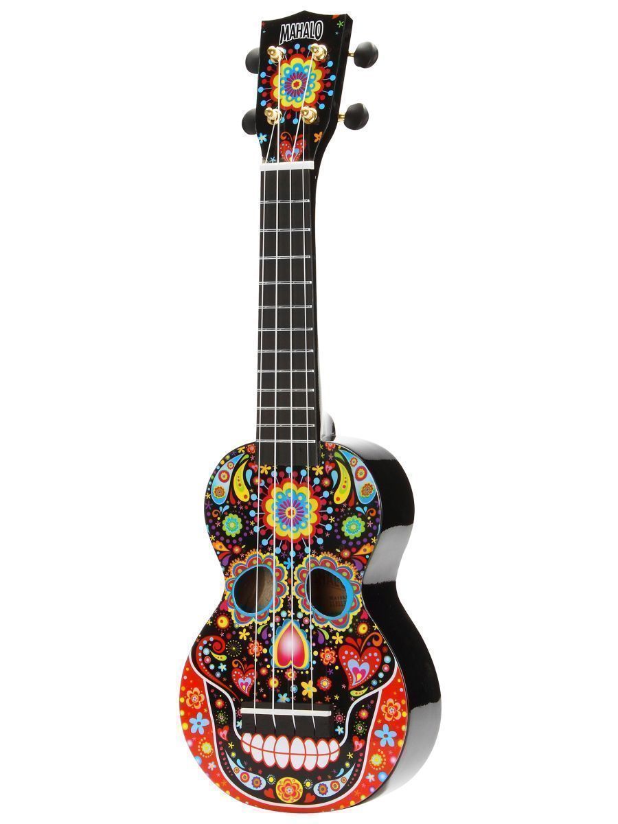 Mahalo MA1SKBK Укулеле сопрано с чехлом, корпус - липа, гриф - габон, накладка на гриф махагони, струны Aquila Super Nylgut, цвет - Black, лакированная, рисунок - череп, серия Art Soprano