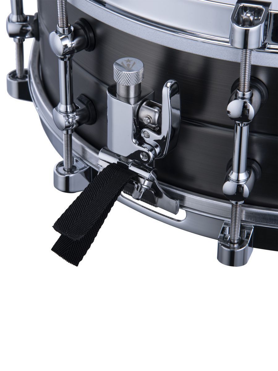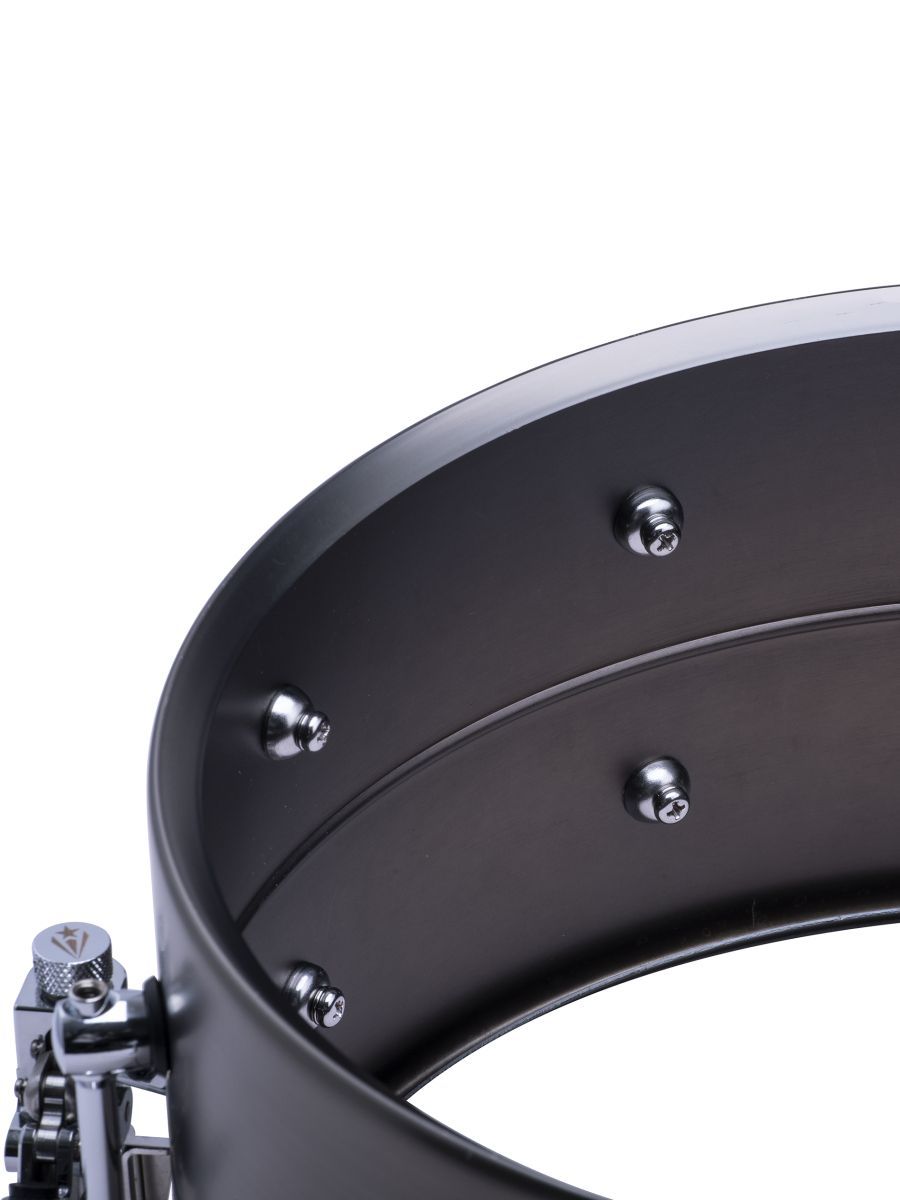 Размер: 14” x 6,5” Корпус: латунь (1,2 мм) Фурнитура корпуса: хромированная Кромка подшипника: внутренняя острая 45° (с обеих сторон) Отделка: матовый античный никель Обод: однофланцевый (латунь) Ударный пластик: Remo Diplomat с покрытием Резонансный пластик: Remo Diplomat Hazy Сторона малого барабана Сетчатый фильтр: OP-01 Кабели малого барабана: ST16-1403 без покрытия из нержавеющей стали (4) 0,6 мм и (10) 0,8 мм и (2) 1,0 мм Модификатор частоты: PFM1465