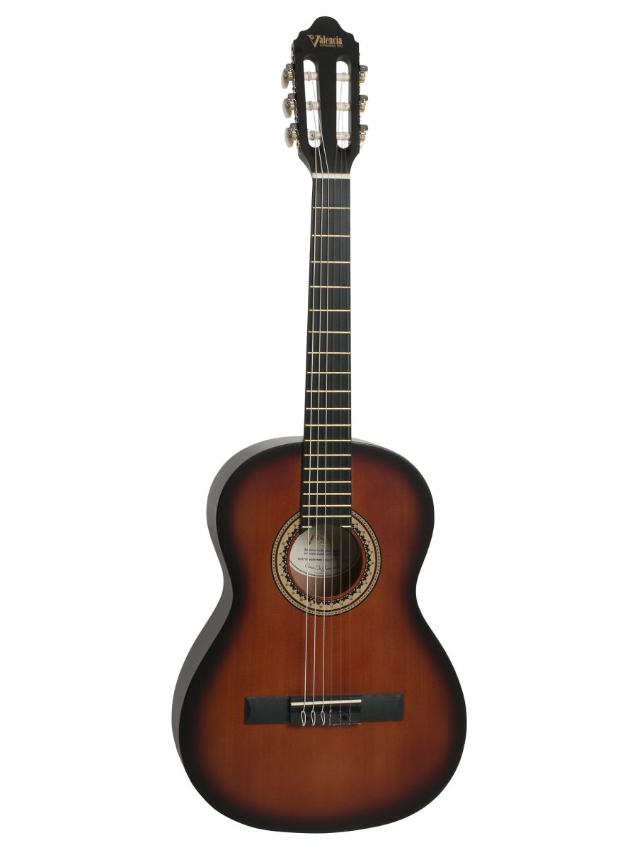 Valencia VC203HCSB Гитара классическая 3/4, верхняя дека: ель, нижняя дека и обечайка: нато, узкий 42 мм гриф: махагони, накладка грифа и нижний порожек: махагони, колки: винтажные, никель, цвет Classic Sunburst